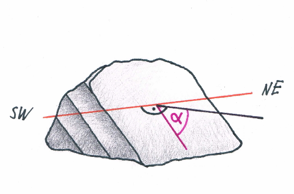 Possibly you might yourself be wondering still why we need that net. Let’s try to satiate this thirst for knowledge, shall we? Have a look at Fig. 4. There you can see a fictional outcrop of layered rock. One of these layers can now be represented as a plane by one dip angle α and the accompanying strike directions. If we now set a GPS point at this outcrop, we can now say that the plane strikes from NE to SW and dips towards SE with the dip angle. Now you must know that instead of letters geologists use numbers to determine the direction. A circle has 360°. Therefor the direction NE is equivalent to 45°. For sake of convenience let’ assume that the plane dips with 45°. With all that knowledge, let’s get to the notation.