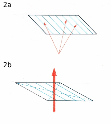 That simple means that there are three spatial directions that are labelled with (x, y, z) or (a, b, c). In order to determine the place of any given point in space, you first must determine the location of the origin. From that you then measure the relative distances of the sections x, y, z to any given point. The hypothetical point in Fig. 1 b therefor has the coordinates (2,2,3). So far so good, but let’s say that we want to determine the position of a plane in the field? Why would you that? Well; I guess that you are all familiar with the concept of faults? A fault is a section that displaces two units of rocks. And this section is often developed as a plane (if you simplify it). For another example you can use the boundaries of two stratigraphic layers, like two layers of sandstone placed onto each other. I think you get the point; planes are quite common. But how do wen measure planes? In classical geometry there are different methods. You can use three vectors (Fig.2a) or a normal vector (Fig. 2b). What is a vector? You remember how we drew a point into the coordinate system in Fig. 1 and labelled it with coordinates? This is basically a vector from the origin to the aforementioned point. Thus, a vector gives you the directions (and indirectly the length) from one point to another. However, the notation is a bit different. Since a vector is a spatial element, we write it as follows: