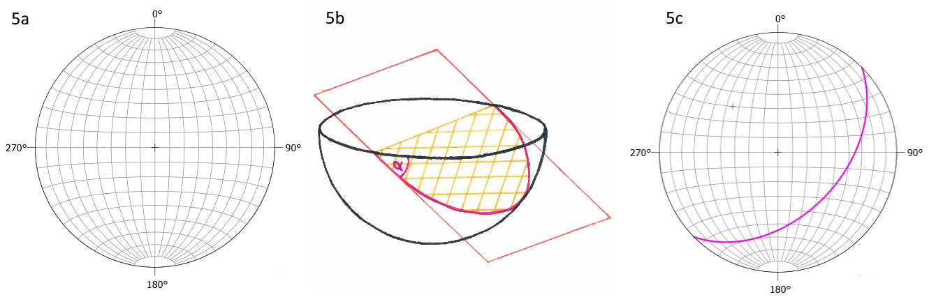 With that knowledge you can now draw the orientation of any plane in a geologic map, but you will not be able to do any calculations with it. Therefor we are now (finally) arriving at the Schmidt’s net. What is this net? Well; look at Fig. 5a and you will see it: