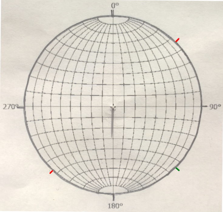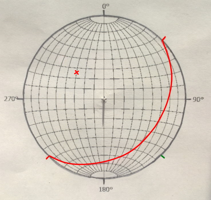In case you are maybe wondering that now: a linear follows the same way of notation as a plane. Therefor; if we use Clar’s notation, this specific linear would strike with 315/30. Just do the same steps as before but skip the drawing of the great circle.