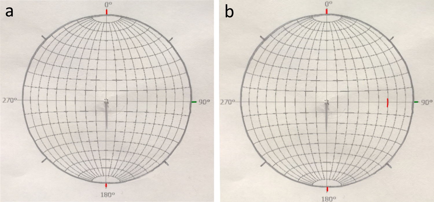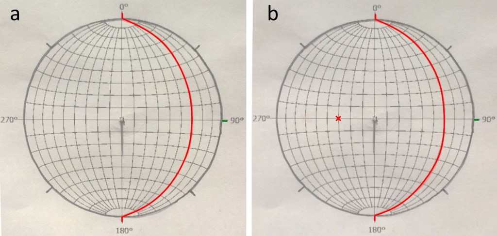 However, you can probably guess that if you draw a lot of great circles into one net, this soon gets messy. Therefor we now use a little trick. Do you remember, how I told you in Pt. I that planes can also be defined by their normal vector? Yes? Good. We call such a vector a linear; in the net is manifests itself as a point. In order to create this point, you just must go 90° on the equatorial line from your dip marking to the other side and make a little cross or other marking there (see Fig. 4b). Especially now this seems a bit pointless, but imagine that we are not dealing with one, but maybe…100 measurements. I think you can agree, that in this case some points are much more helpful than 100 circles. However, you of course must specify that these linears are the normal vectors of the planes.