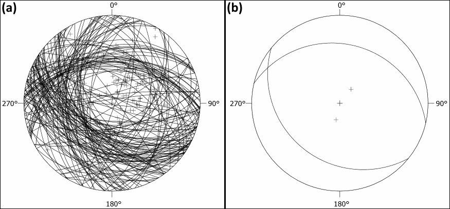 In Fig. 2a you can see all the directional values that we measured in the field. Quite confusing, right? How in hell are you supposed to see anything in there? Well, we only need two planes, one for each limb, right? So that’s what I did for Fig. 2b. By applying a cluster analysis and defining only two clusters we eventually end up with two planes with the following (Clar’s notation) values: