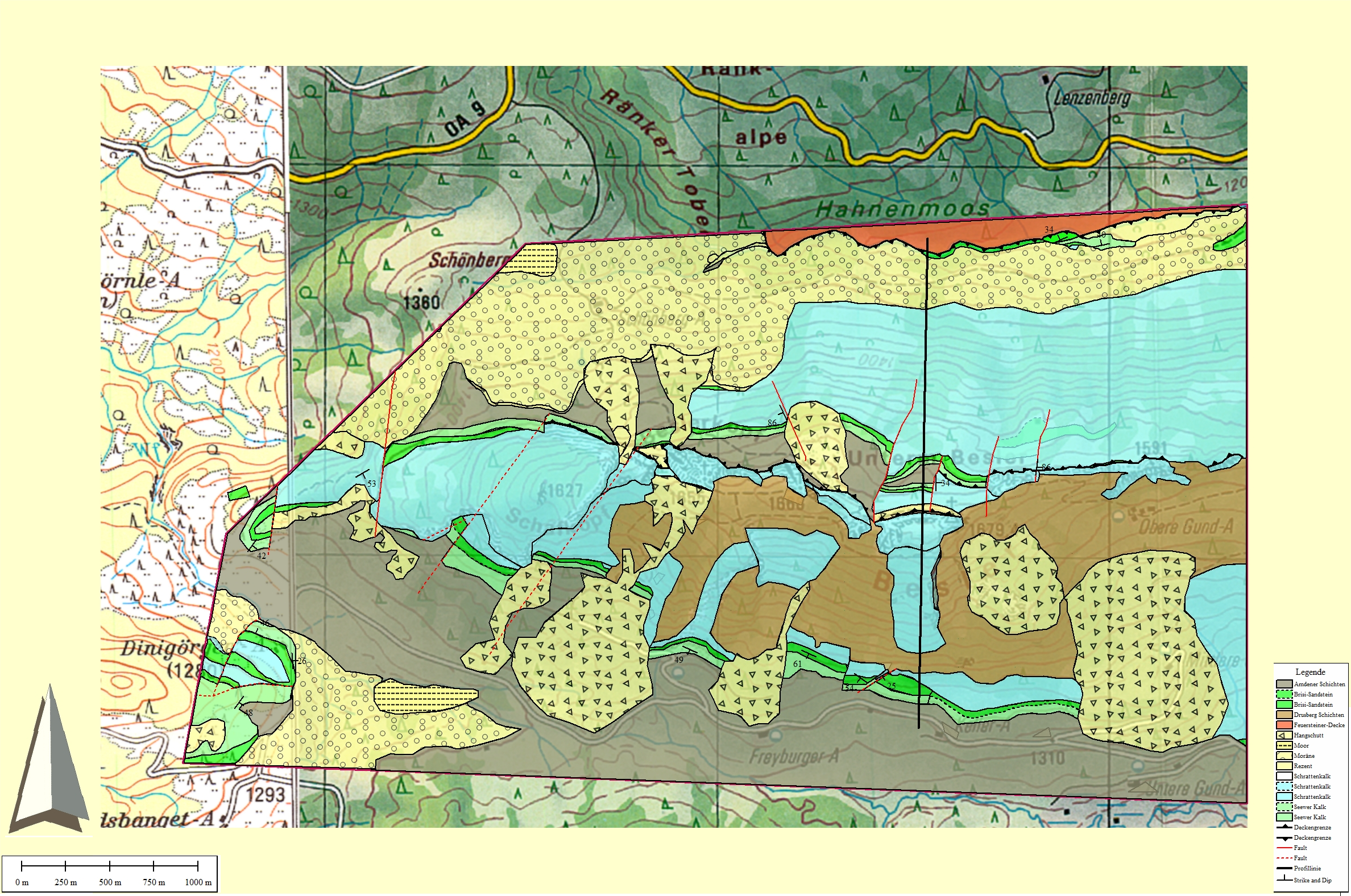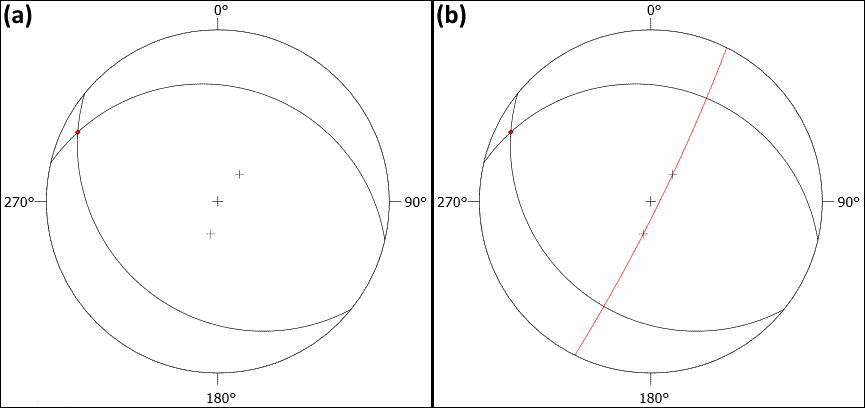 So…that’s it? Is that all, it is really that simple? Of course not, because now we are expanding a bit on that. Look back at Fig. 1. Do you see how the normal points of the planes all fall on one line? That is no coincidence. Remember the fold terminology: the plane that crosscuts the axial plane is called the profile plane and what do you get in Schmidt’s net, when you draw a line through several vector points? A plane, correct! Therefore, the normal points of the fold limbs create the profile plane. In fold analysis we call that one the π-plane or π-circle (Fig 3b). This plane can give us some field information: In the fold terminology I wrote that the π-plane is decoupling units of rock. Now take a look back at the map of the real-world example fold. Do you see how the main faults (meaning areas where blocks of stone have been moved relatively to each other; meaning units of rocks are decoupled) are more or less perpendicular to the fold axis? That means that the π-circle should incorporate the normal vectors of the planes and its normal vector should be where the fold axis is, right? And look at that, that is what is happening in Fig. 3b! Therefor the π-circle shows itself in the net with the measurements 116.3/84.7 (Clar’s notation). See, it all makes sense now: the π-circle is a representation of faults that are directly related to the folds.