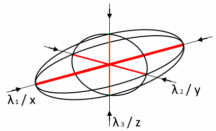 You will see that the strain ellipsoid is similar to the stress ellipsoid. The seemingly only difference is the different labelling of the axes, right? Right?? NO! Take a closer look! The formerly longest axis in the stress ellipsoid was the vertical axis, right? Now, in the strain ellipsoid this axis is the shortest one. Therefore, we can infer that the stronger the stress in a given direction is, the stronger the deformation [strain] will be in this direction. As for labelling there are two variants; x, y, and z, as well as λ1-3. As already alluded to, now by definition is given: